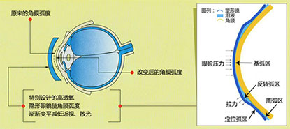 由于镜片与角膜之间泪液层分布不均,通过配戴后产生的流体力学效应以及眼睑对镜片中央的压力,使角膜中央区域的弧度在一定范围内变平,从而降低一定量的近视度数。